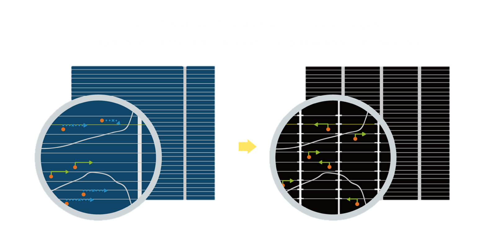 - 多條電極柵結構,可有效降低外力對於電池的影響,限制電池隱裂 (Micro-cracks) 範圍,防止電流傳輸路徑 (Current distribution) 之損壞進一步擴大。